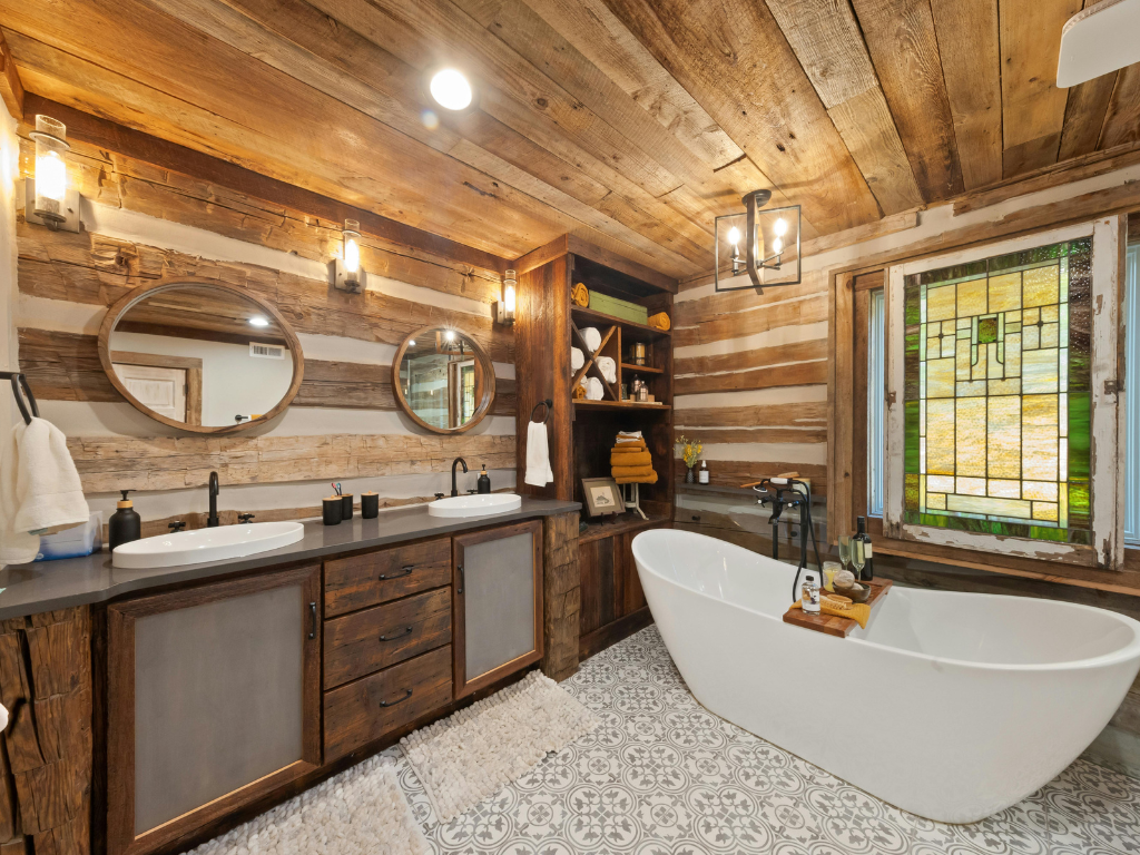 Rustykalna łazienka przywodzi na myśl wnętrza starych wiejskich domów – z drewnianymi belkami, kamienną podłogą i pastelowymi dodatkami. Cechują ją: