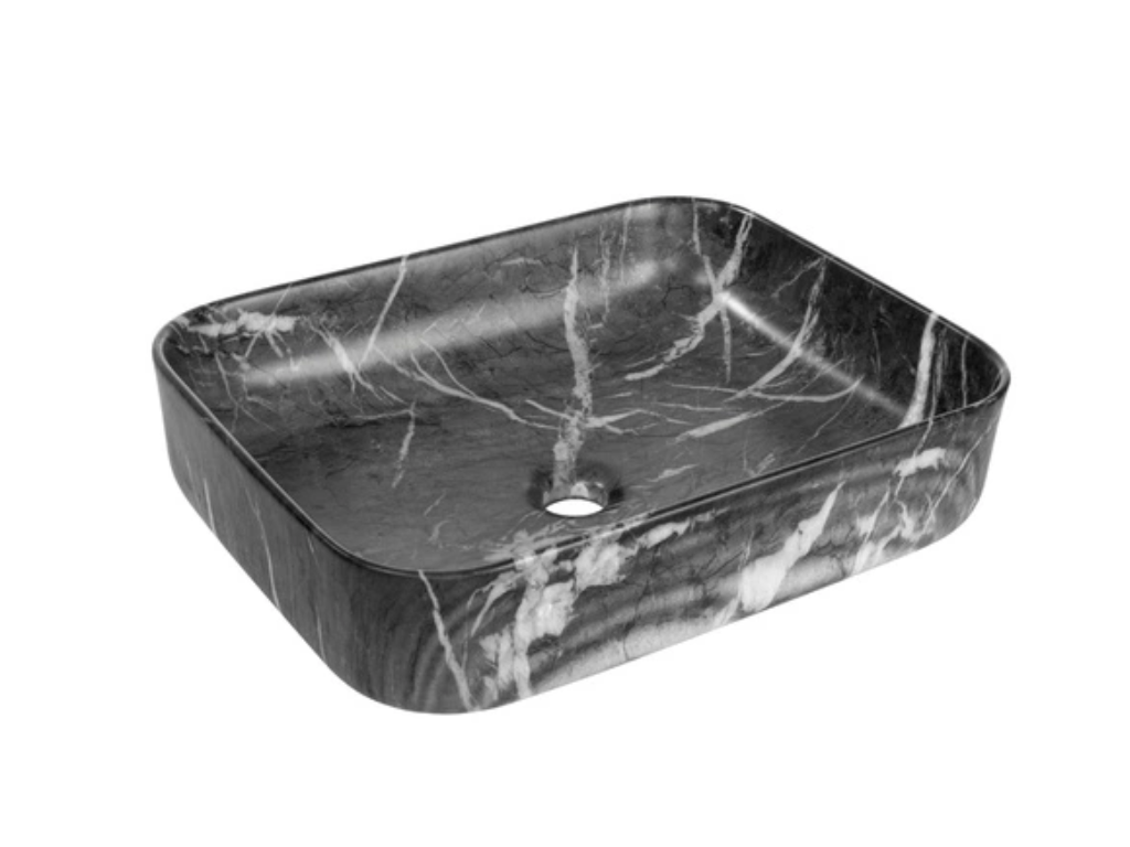 Umywalka nablatowa Invena Florina to propozycja dla osób, które pragną nadać swojej łazience wyjątkowy charakter. Połączenie prostokątnego kształtu w matowym wykończeniu oraz ciemnego grafitu z marmurowym efektem idealnie sprawdzi się do rustykalnego wnętrza.