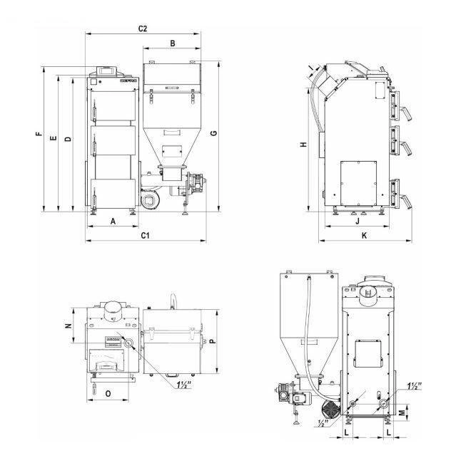 Wymiary techniczne: A: 480 mm, B: 530 mm, C1: 1135 mm, C2: 1068 mm, D: 1256 mm, E: 1275 mm, F: 1358 mm, G: 1410 mm, H: 1156 mm, I: Ø 159 mm, J: 535 mm, K: 804 mm, P: 600 mm, L: 95 mm, M: 160 mm, N: 261 mm, O: 386 mm