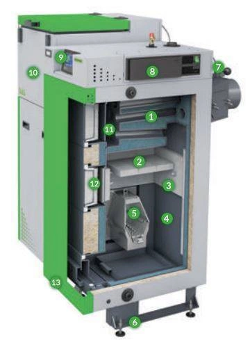 Wyposażenie: sterownik (ST-555P), palnik SAS MULTI FLAME (moduł sterujący praca palnika, grzałka do rozpalania, mechanizm ruszt ruchomych, fotokomórka – czujnik ognia, czujnik temp. podajnika), wentylator (system kontroli przepływu powietrza - AIR FLOW CONTROL), termometr, zawór bezpieczeństwa, kratka zabezpieczająca żar, zasobnik paliwa z czujnikiem otwarcia klapy, czujnik temperatury spalin, ogranicznik temperatury bezpieczeństwa STB, komplet stopek regulacyjnych, komplet narzędzi do obsługi kotła