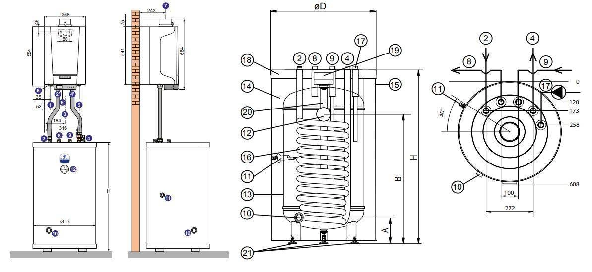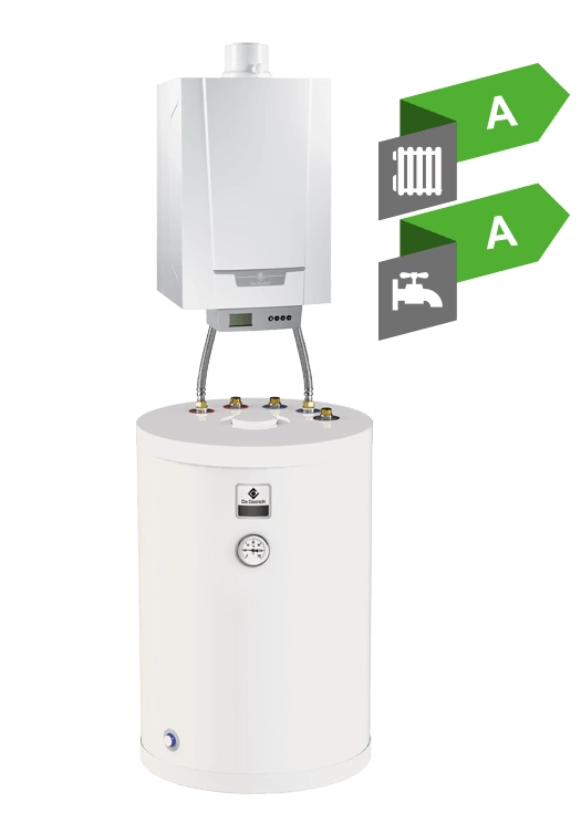 • Naścienny gazowy kocioł kondensacyjny wstępnie wyregulowany fabrycznie, w pakiecie z emaliowanym podgrzewaczem c.w.u. o pojemności 150 litrów umieszczonym pod kotłem, chroniony antykorozyjnie anodą magnezową
