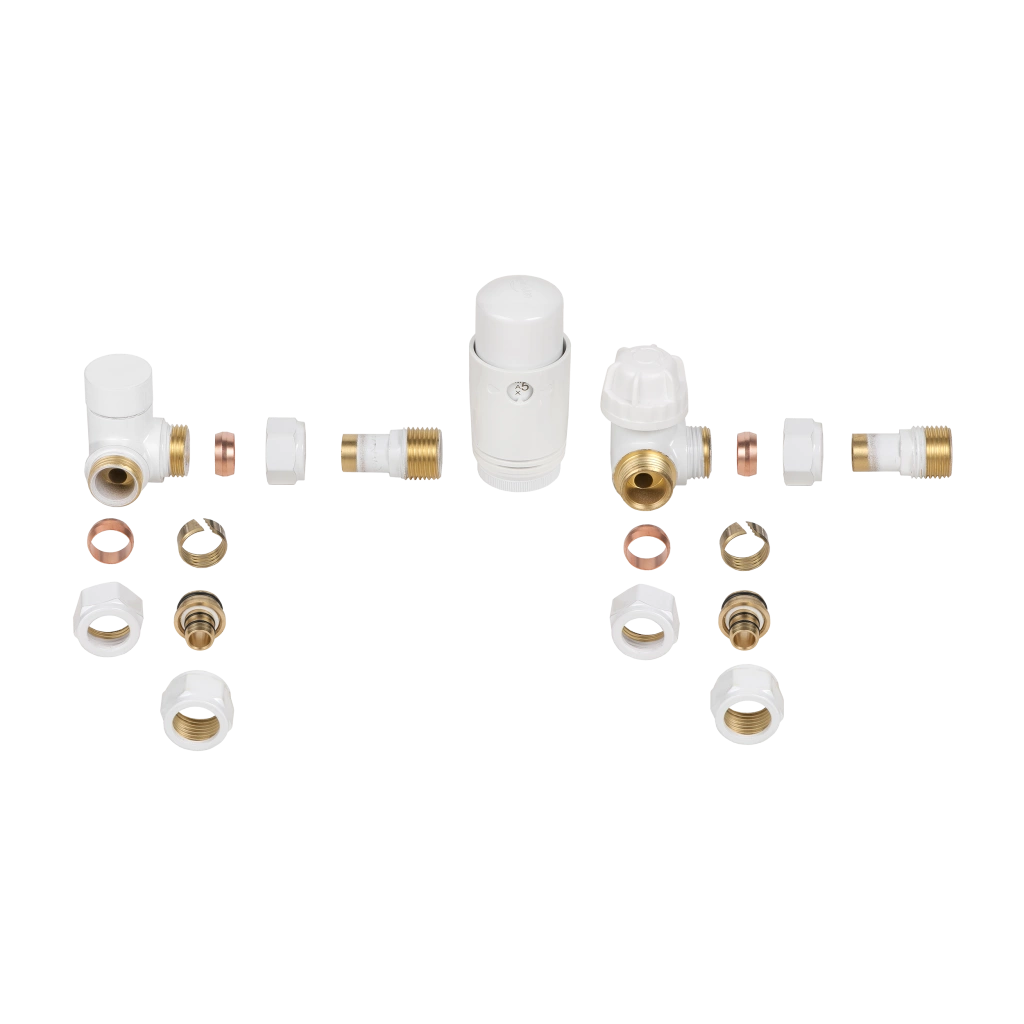 Zestaw w białym kolorze doskonale komponuje się z grzejnikami w klasycznych wnętrzach, zapewniając estetyczny wygląd i niezawodną pracę instalacji grzewczej.
