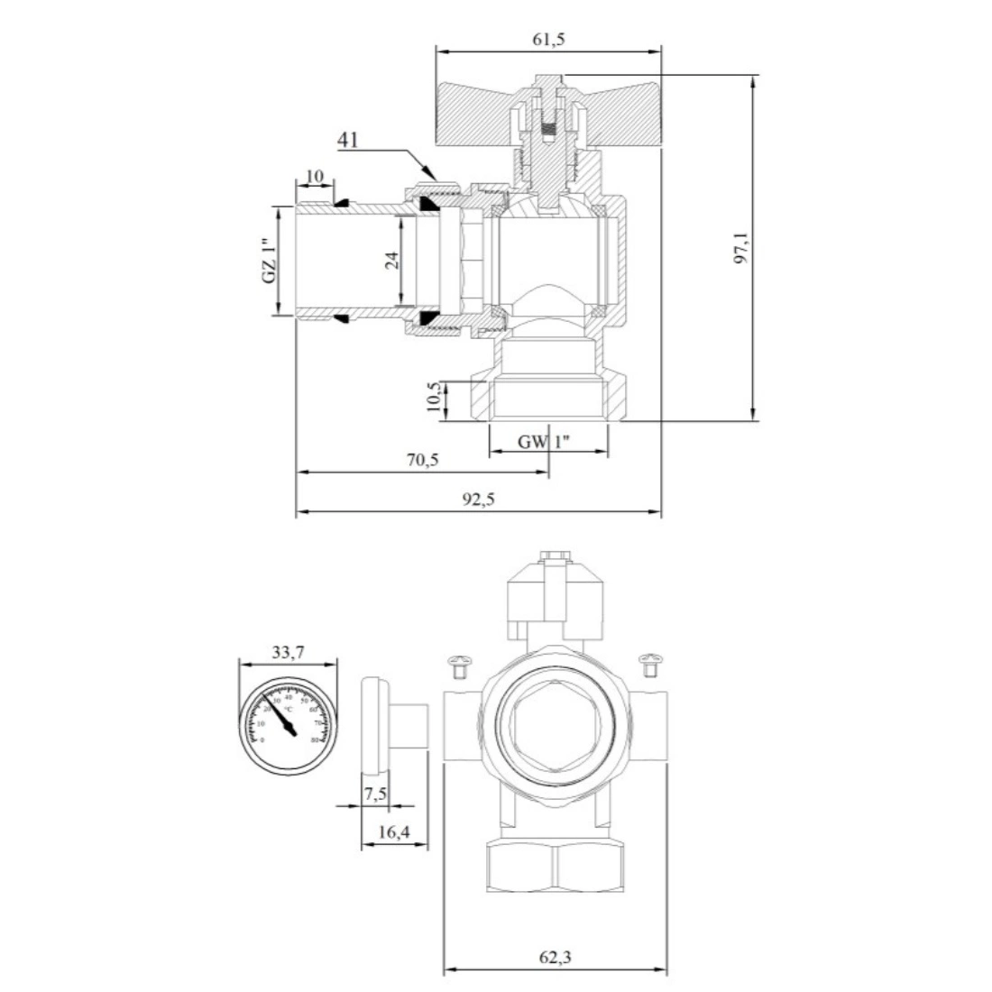 Komplet zaworów kątowych z termometrem motylek 1" GW/GZ Invena (ZK-30-025-Z)
