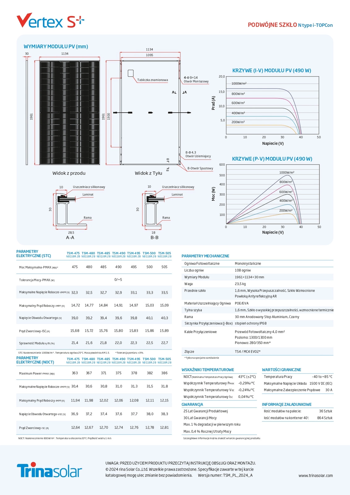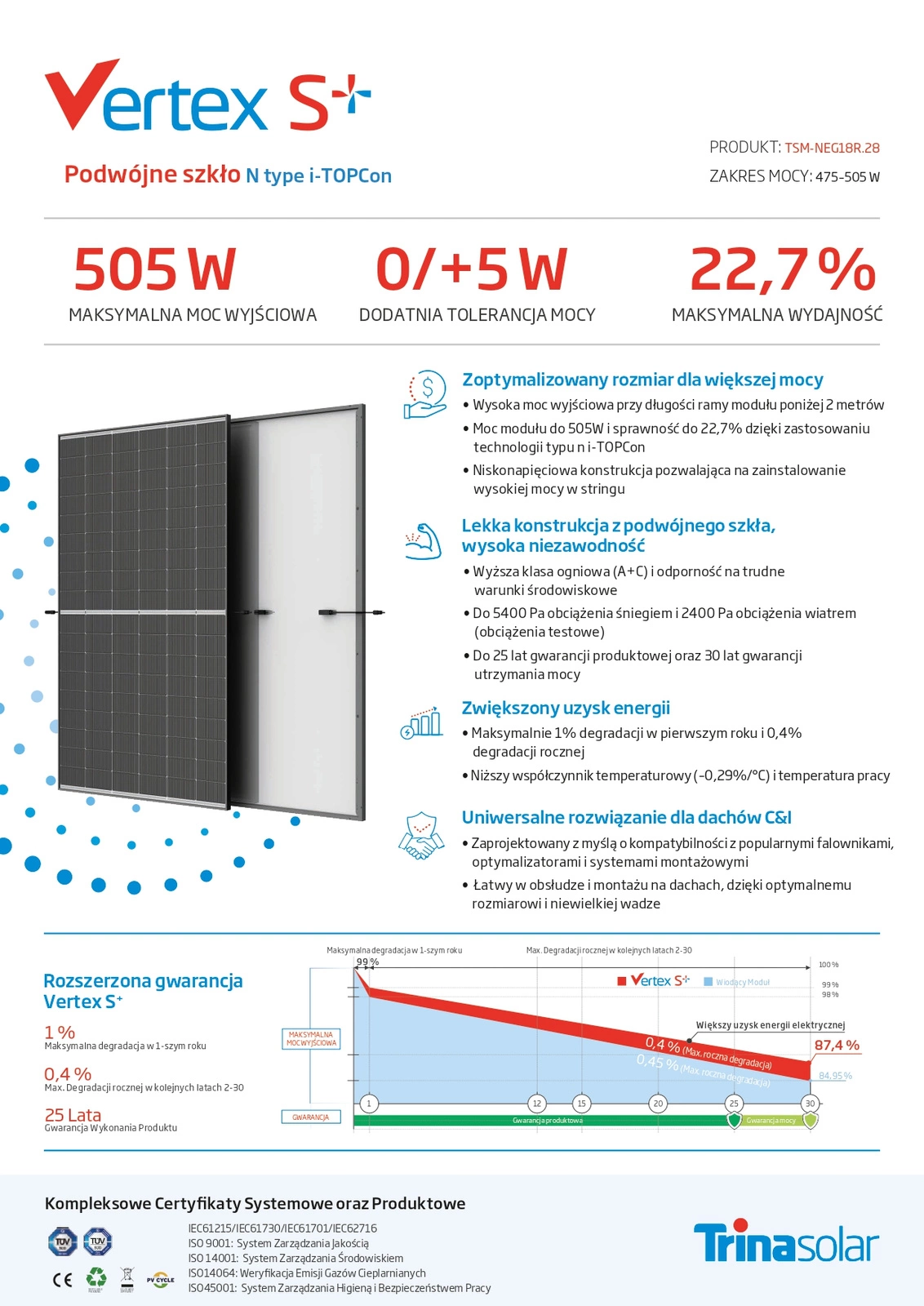 Zaawansowany panel fotowoltaiczny TRINA Vertex S+ o mocy 490W to wydajne źródło energii oparte na technologii ogniw n-type TOPCon. Model ten łączy wysoką sprawność z kompaktowymi wymiarami i eleganckim, czarnym wykończeniem, dzięki czemu doskonale sprawdzi się zarówno w instalacjach domowych, jak i komercyjnych.