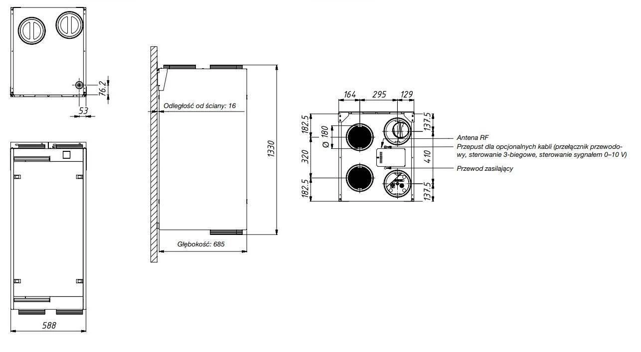 - Przyłącza kanałów powietrza na górze i na dole, z możliwością montażu na prawą lub lewą stronę