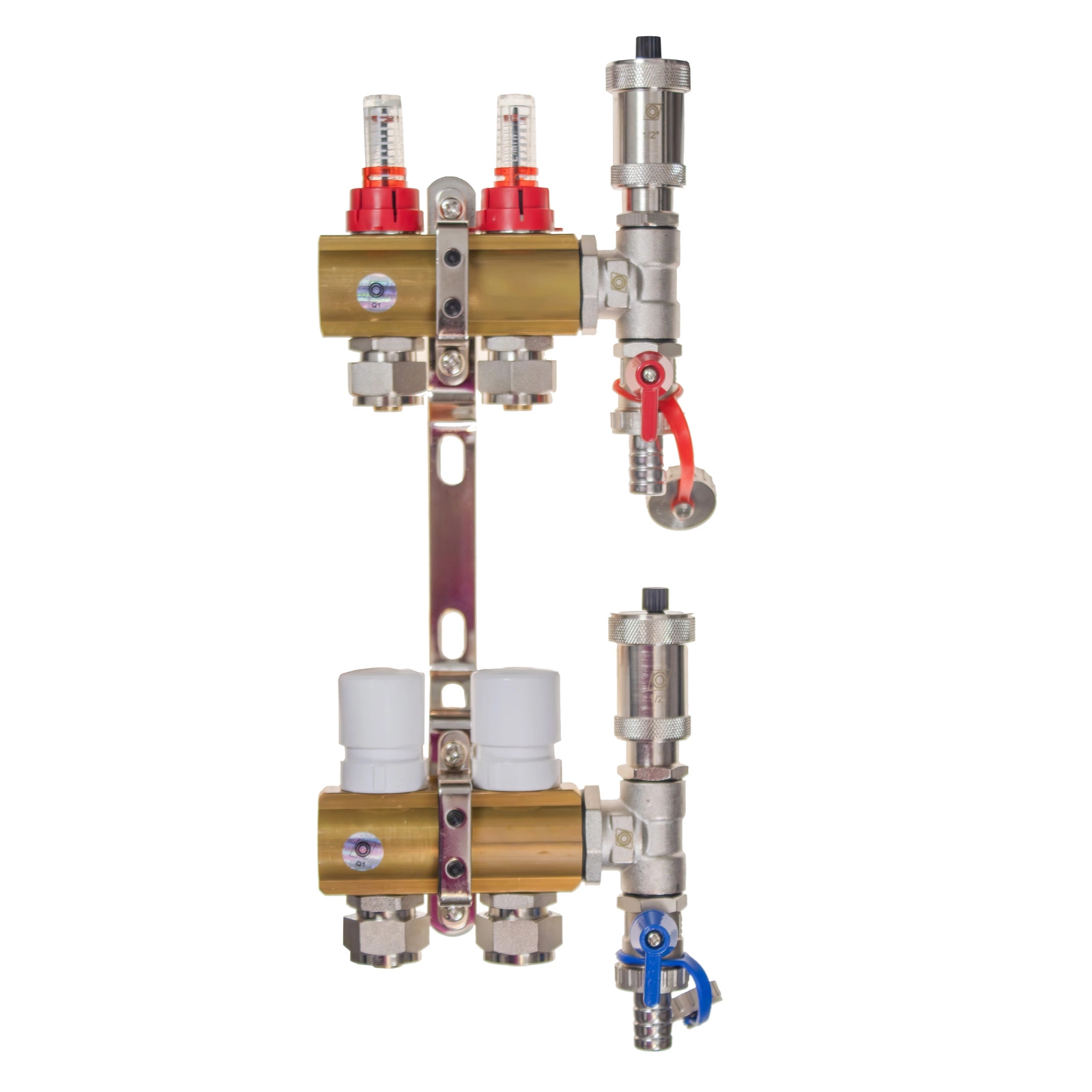 Wysokiej jakości rozdzielacz mosiężny dedykowany do systemów ogrzewania podłogowego, zaprojektowany z myślą o łatwości montażu i wygodnym użytkowaniu. Produkt ten jest wytwarzany z certyfikowanych europejskich surowców przy użyciu najnowszej technologii CNC, co gwarantuje najwyższą jakość i trwałość bez zbędnego przepłacania.