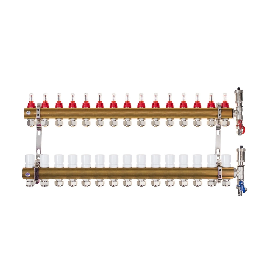 RTR RMOP-KOSA-E-15 to trwały i precyzyjnie wykonany rozdzielacz z mosiądzu, zaprojektowany do obsługi 15 niezależnych obwodów ogrzewania podłogowego. Mosiężna konstrukcja zapewnia odporność na korozję oraz wieloletnią, bezawaryjną eksploatację.
