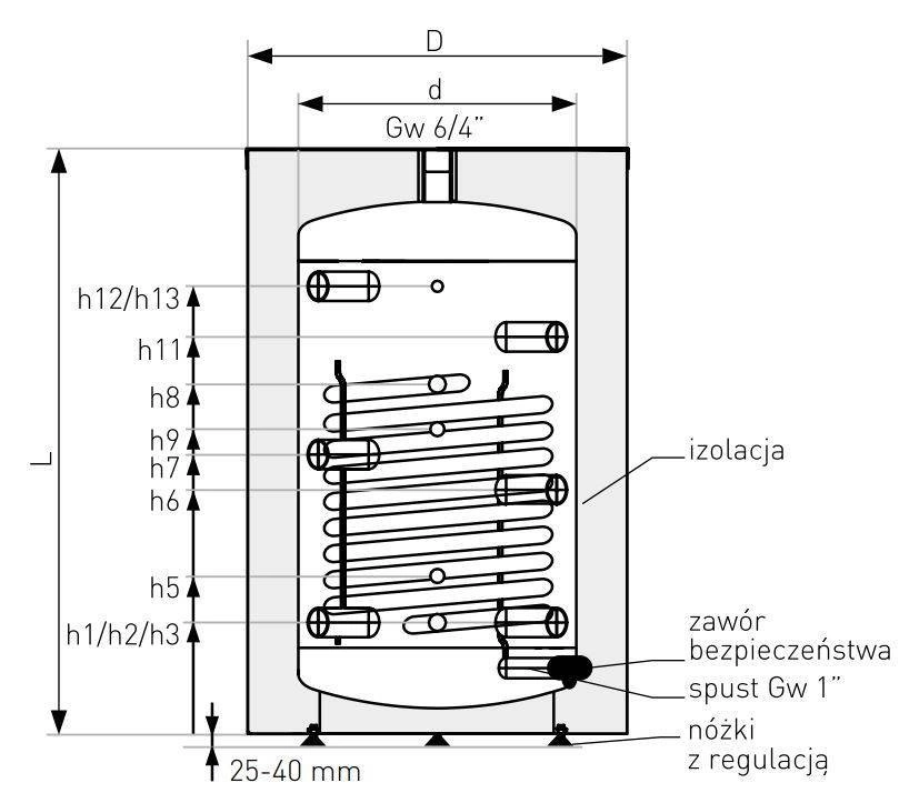 h8 - zasilanie wężownicy (Gw): 1"/690 mm